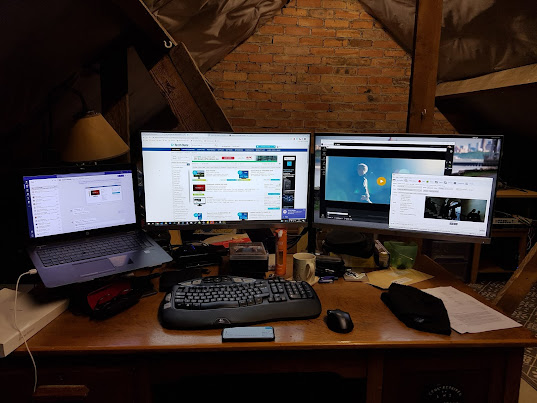 Just before the first lock-down was announced I had finally persuaded work to buy me a couple of decent sized monitors (HPs although I can't remember the model) and a dual-screen mounting arm. These sat in an empty office, burning warranty, for several months until I had my desk set up. Now it's in my man-cave and looking pretty cool, if I do say so myself...